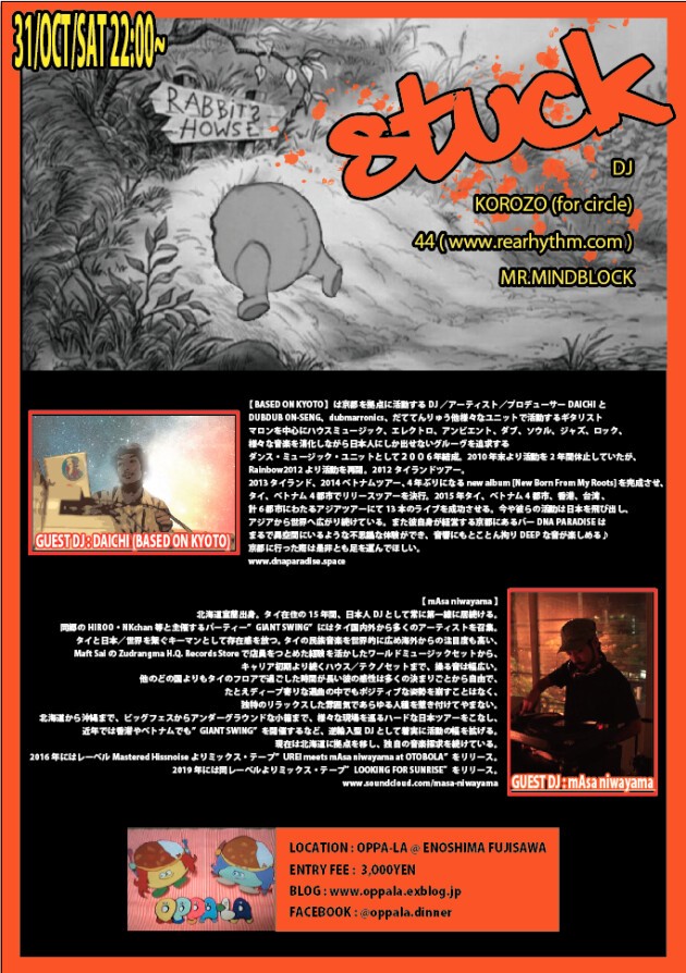 今回のゲストDJ mAsa niwayama が15年前にバンコクにて 録音したミックスCDを当日ご入場していただいた先着20名様にプレゼント♪ この贅沢な二人のDJを湘南で堪能できるのは今回のSTUCKだけなんでお見逃しなく(^^♪
