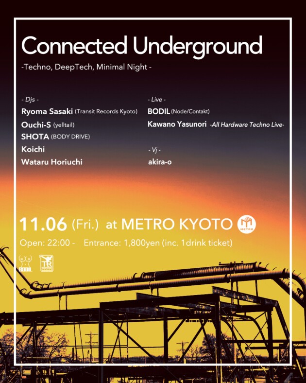 Currently he is playing in an underground techno/house party『Connected Underground』,『Deep Underground』,『yelltail』, all held in "Kyoto Metro" that is legendary night club in this historical city.
