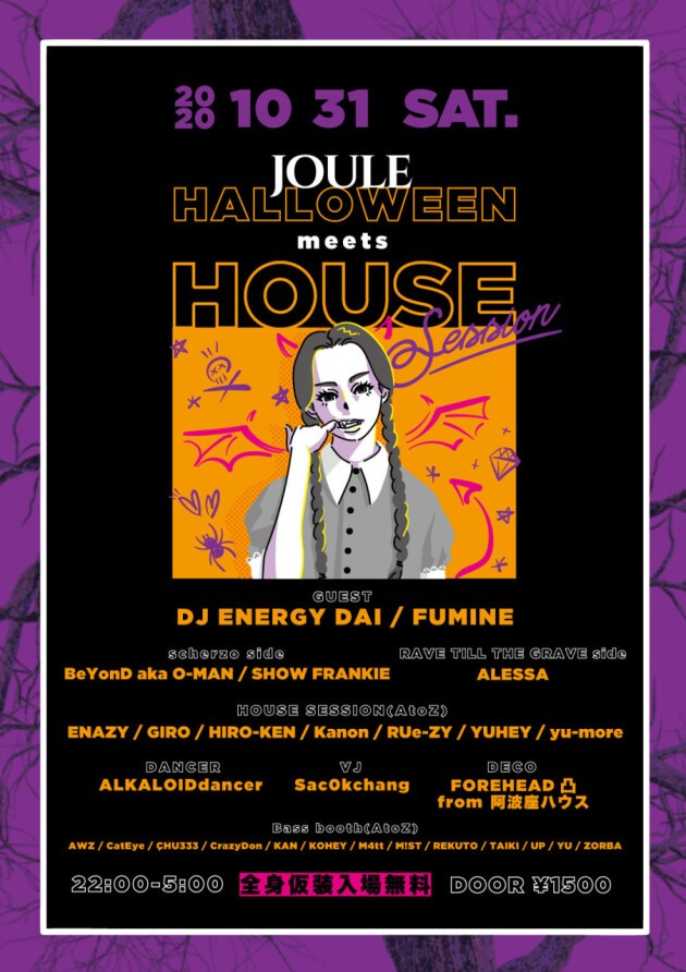 今年のHALLOWEENは全てのMUSIC FREAKSが楽しめる新しいHOUSE PARTY『HOUSE SESSION』にあらゆる方面で活躍するDJが集結!メロディアスかつ、ハードなサウンドスタイルが特徴の大阪が生んだスーパーDJ ENERGY DAI、全国で活躍中のDrum & Bass DJ FUMINE、club JOULEレギュラーイベントscherzoからBeYonD aka O-MANとSHOW FRANKIE、RAVE TILL THE GRAVEからALESSAも出演!一晩中Bass Musicを楽しめるBass boothもあり、全てのオーディエンスが楽しめるHALLOWEEN PARTYとなること間違いなし!