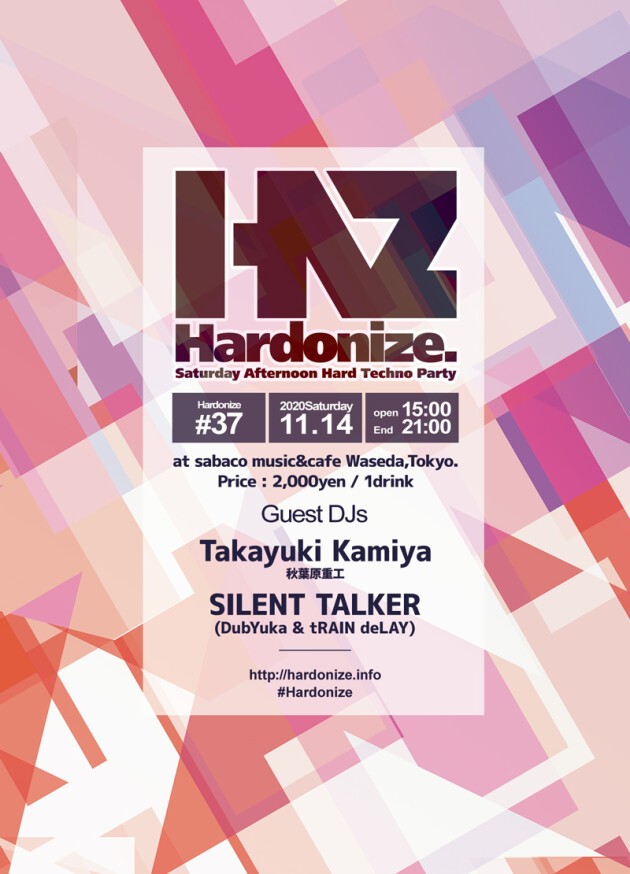 今回のゲストは秋葉原重工からTakayuki Kamiya&10/17に発表されるHardonize初の公募企画優勝者、SILENT TALKER (DubYuka & tRAIN deLAY)の2組でお届けします。前回は配信イベントでしたが、今回は入場に上限ありますがフロア開放(予定)です!!およそ8ヶ月ぶりにハードテクノを聞きながらみなさんと楽しくフロアでお会いできることを楽しみにしております!!!