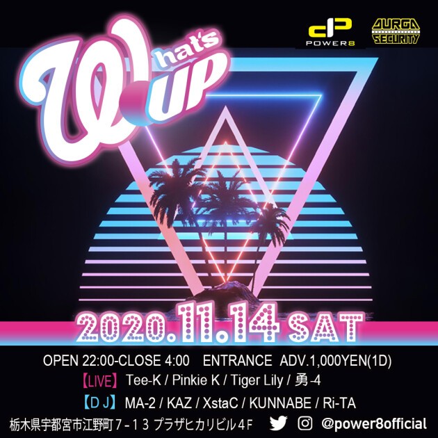 「What’s Up!?」(ワッツァップ) !!が、帰ってきた!! 新譜から旧譜まで幅広く聞けるHIP HOP PARTY LIVEありDJありで県内のアーティスト大集結! 11/14は『POWER8』に集合!!