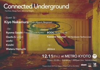 Currently he is playing in an underground techno/house party『Connected Underground』,『Deep Underground』,『yelltail』, all held in "Kyoto Metro" that is legendary night club in this historical city.
