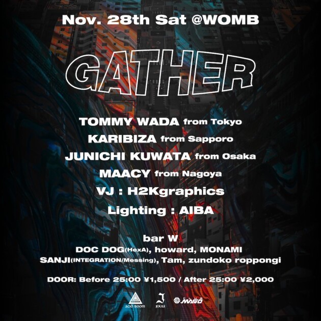The DJs gathering at the party GATHER held at Shibuya WOMB on Saturday, November 28 are TOMMY WADA from Tokyo who is the host of SESSION, KARIBIZA from Sapporo who is the resident of Chord which is main party at the club ACID ROOM, Maacy from Nagoya who is active mainly in the long-established club MARGO, and JUNICHI KUWATA from Osaka who is active as a resident of the regular party SPECTACULAR at CLUB JOULE.