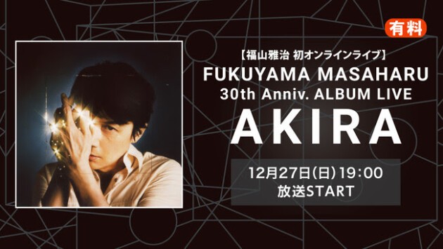 12月8日、福山雅治が6年8ヶ月ぶりとなるオリジナルアルバム「AKIRA」をリリース。そのアルバム全収録曲を披露する自身初のオンラインライブを開催。ニコニコ生放送ならではの、コメント機能で盛り上がろう。