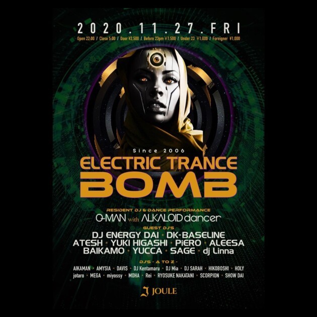 11月27日 (金) は、2006年よりアメリカ村 Club joule にて開催中の ELECTRIC TRANCE BOMB が、新旧合せた豪華なライナップで再び開催決定!