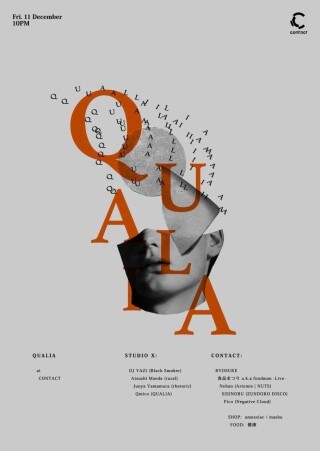その一夜を彩るのは、国内外からの信頼も厚く、恍惚感覚えるディープトリップミュージックの魔術師であり、常にフロアを揺らし続けるテクノ界の重鎮〈Black Smoker〉所属のDJ YAZI。オープンエアーイベントrural主催かつDJとしても台湾のOrganik FestivalやトビリシのBassiani、テルアビブのThe Blockなど海外でも聴衆を虜にしているAtsushi Maeda。NYで培った感性を軸に、繊細緻密且つディープなプレイスタイルで世界を創り上げるrhetoric、proto-主宰Junya Yamamura。そして当パーティQUALIA主宰のQmicoが登場。一夜にして漆黒のダンスフロアを創り上げる。
