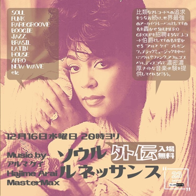 比類なきレコードへの追求を今なお続け、世界最強のアーカイヴ・レーベルとしてその名を轟かせるNUMERO GROUPを招聘するなど、レコード伯爵として一部の間でしられるレコード伯爵こと、 "アルマ ケイ" プレゼンツ。ブラックミュージックを中心にソウルやファンク、アフロ、ゴスペル、ディスコなど濃密濃厚ナイトな音楽体験を提供してくれるだろう。