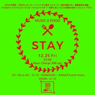 MOVEの週末、平日のレギュラーイベントから集まったメンバー達が音届ける、異種音楽交流編。 FOODはクリスマスにピッタリな "クラムチャウダー" 貝類と色とりどりの野菜の具だくさんスープです。 12/25(金) -MUSIC & FOOD- STAY (ALL GENRE) PM 10 START MUSIC CHARGE ¥500 DJ : His-a-shi / なべ3 / WANCHIN / KANATA / and more... FOOD : なべ3