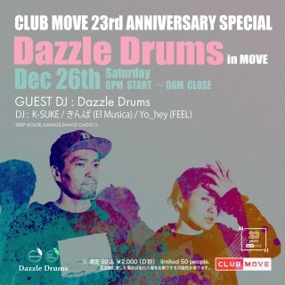 コロナ禍で今春に出来なかったMOVEの23周年、年末の最終土曜日に東京よりアンダーグラウンドなハウスフリークやコアなパーティーフリークやダンサー達の間でも絶大な人気を誇る "Dazzle Drums" を迎え夕方から開催します。