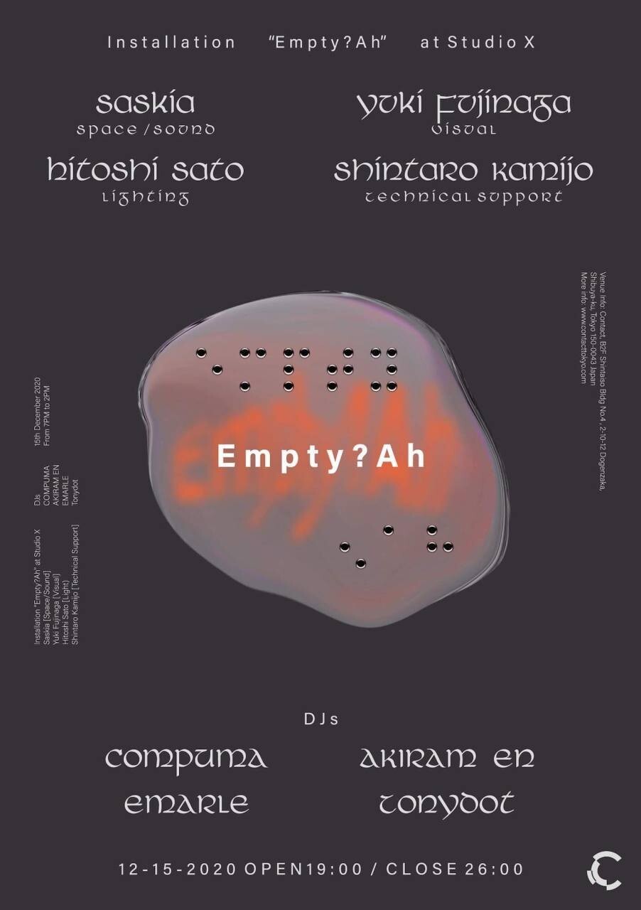 カオティックな時代における希望的な前進として、Contact Tokyoに一夜限りの空間作品 “Empty?Ah” が出現する。脳や心といった身体に備わる機能が私たちにどのような影響を与えているかを熟考しながら現実と想像の関係性を探るのはbroadや解体新書、ライゾマティクス主宰 Super Flying Tokyoへの出演を中心にライブアクトとして国内外で活動するSaskia(ex. Saskiatokyo)。音・光・言語が相互作用することで全ての感覚が歪む空間には、非常に滑稽な妄想の端くれが浮かび上がり、そしてその夢が次なるストーリーを紡ぐことを示唆する。