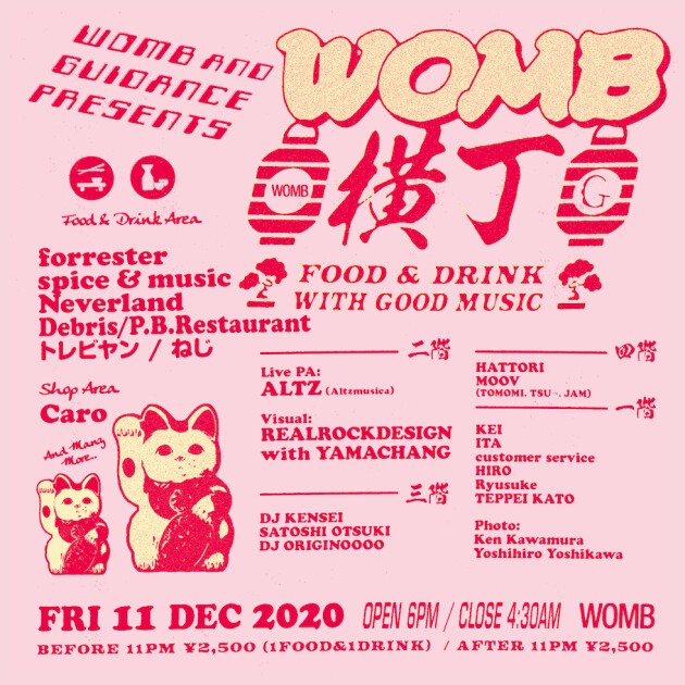 WOMB と、意識や感情の共有をコンセプトに長きにわたり活動を続けきたパーティー Guidance が送るパーティー、題して 「WOMB横丁」がキックオフ。コンセプトは、"FOOD & DRINK with GOOD MUSIC"、つまり、良い音楽を聴きながら美味しいお酒と食べ物を楽しもうという企画。