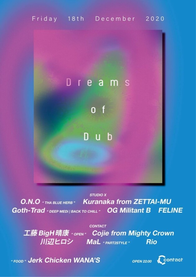 今回Studioフロアには、THA BLUE HERBの全トラックメイクを手掛け、その手ひとつで独自のサウンドを展開し続けているO.N.Oがダブセットを披露する他、今年25周年を迎えた日本唯一のロングランパーティ「Zettai-Mu」を主宰するKuranaka a.k.a 1945、新宿OpenでのJoy Ride、吉祥寺cheekyでのFormationを主宰するOG、UKベースミュージック/レフトフィールドを主軸としつつ、様々な色を織り込んでいくミックススタイルが特徴のFelineが、それぞれの解釈でダブセットをプレイする。後日アナウンスされるゲストにも期待して欲しい。そしてContactフロアでは、クロアチアで開催される世界最大級のベース・ミュージックの祭典Outlook Festivalの常連でもあるPARTY2STYLEのMaLが前回に続き登場。新宿の老舗レゲエ/ダブクラブOpenの”校長” 工藤 BigH 晴康、Mighty Crownのセレクターの一人で、ニュールーツ/ダブのレーベル〈SCORCHER HI FI〉のプロデュースも手掛ける選曲家Cojieを迎え、TOKYO No.1 SOUL SETの屋台骨を支えるトラックメイカーでもある川辺ヒロシもダブセットにて出演する。今回も、音楽の自由がもたらしたダブという巨大な産物を様々な視点から楽しんでほしい。