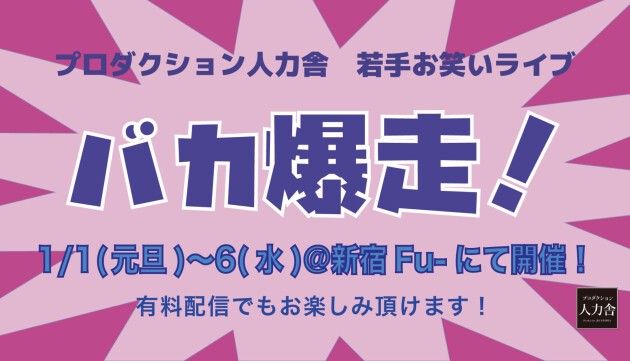 プロダクション人力舎の若手芸人による定期ライブ「バカ爆走!」2021年1月公演が劇場にて開催決定!