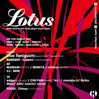 Lotus 2021.2.14 sun 13:00〜20:00 @R lounge genre:techno/house/bass entrance:¥2,000 w/f:¥1,500