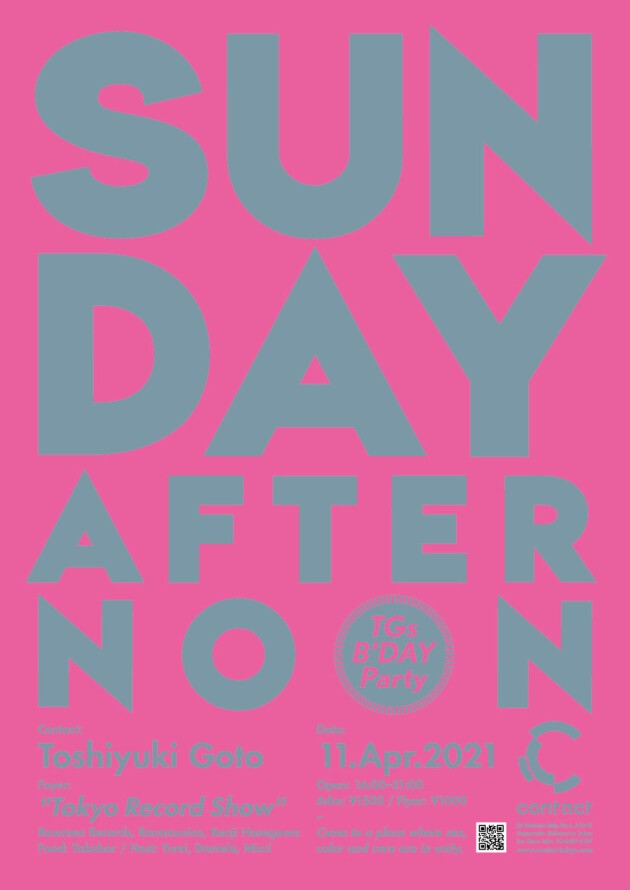 東京で日曜日の夕方から始まるパーティの先駆けともいえるSUNDAY AFTERNOON。ニューヨーク仕込みのToshiyuki Gotoが、人と人とのエネルギーを大切にし、人種や性別を超え、ハウスミュージックを中心に20年間続けているこのパーティで、ジャンルに囚われることなくファンキーでエモーショナルな5時間エクスクルーシブセットを披露する。