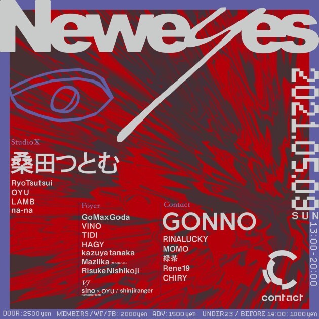 2021年世界は未曾有の危機を乗り越えるために試行錯誤を繰り返している、人々がユートピアに辿り着くために新しい実験が始まる「Neweyes」新しい視点から本来あるべきダンスミュージック、パーティの再構築を図る。第一回目のゲストには桑田つとむ、Gonnoとキャリアに裏打ちされた両雄がそれぞれのフロアーで独自の音楽を披露する。Neweyesから始まるダンスミュージックを五感で感じ取ってほしい。