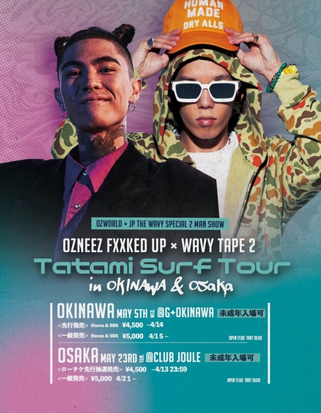 OZworldの2nd アルバム"OZKNEEZ FXXKED UP" と、JP THE WAVYの2nd EP "WAVY TAPE 2"のリリースを記念して、初の2マンライブ<"OZKNEEZ FXXKED UP × WAVY TAPE 2" TATAMI SURF TOUR>を沖縄&大阪限定で開催!