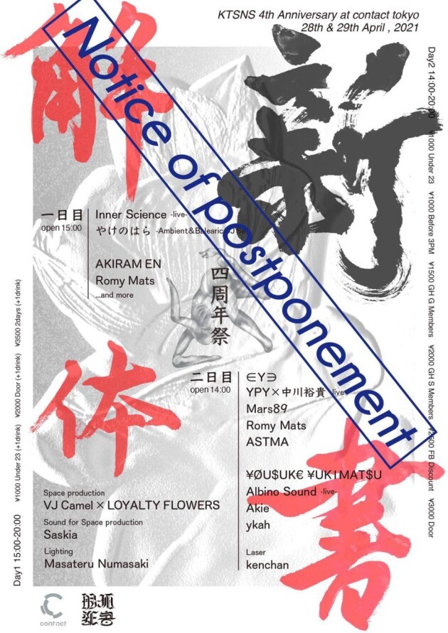 Due to the state of emergency, Tokyo Metropolitan Government has requested the business suspension. The event 解体新書 四周年 -Kaitaishinsyo- scheduled on 4/28 (Wed.) will be postponed. We ask you for your understanding in this matter.