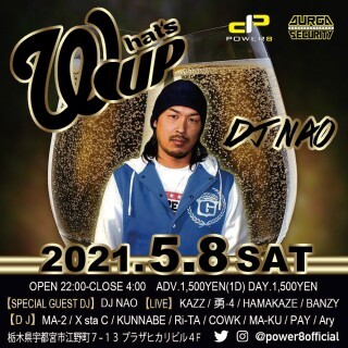 2021年「What’s Up!?」(ワッツァップ)が始動 !! 新譜から旧譜まで幅広く聞けるHIP HOP PARTY LIVEありDJありで県内外のアーティスト大集結! 全国から根強く人気のある「DJ NAO」が来宮!! 5/8はPOWER8に集合!!