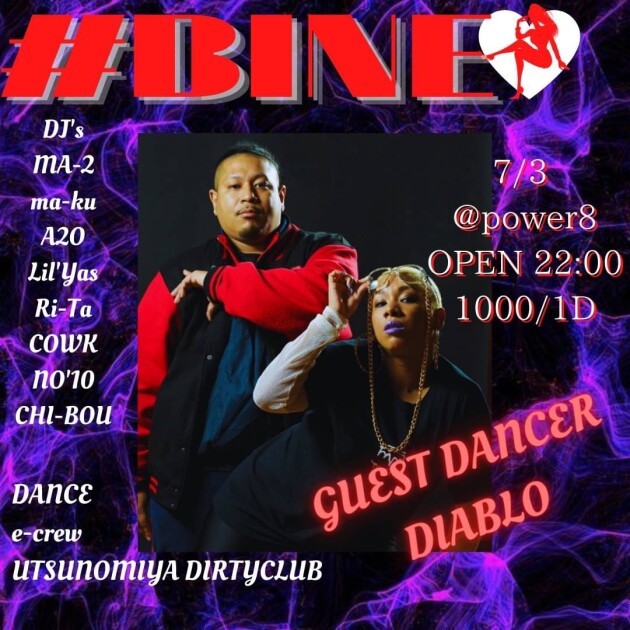 毎月第一土曜は #BINE!! その言葉と共に毎月お祭り騒ぎのPARTY 『#BINE』 7/3の#BINE は 栃木県内外で活躍するDANCERが参戦!! SHOW CASEは勿論のこと DJ TIMEまでもバッチリフロアを盛り上げてくれる事間違いなし!!