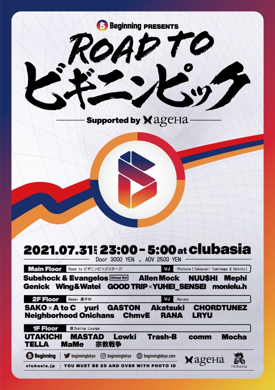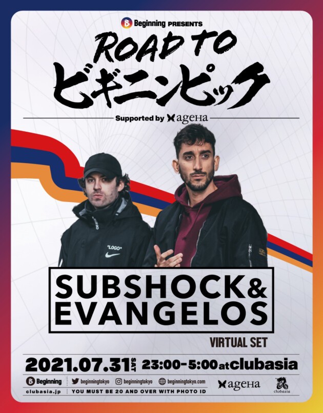 9/4にageHaにて行う「ビギニンピック」の前哨戦として「Road to ビギニンピック Supported by ageHa」をclubasiaにて開催!Virtual setでSubshock & Evangelosなど豪華ラインナップが登場!!