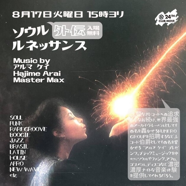 比類なきレコードへの追求を今なお続け、世界最強のアーカイヴ・レーベルとしてその名を轟かせるNUMERO GROUPを招聘するなど、レコード伯爵としてその名を響かせる "アルマ ケイ" プレゼンツ。ブラックミュージックを中心にソウルやファンク、アフロ、ゴスペル、ディスコなど濃密濃厚ナイトな音楽体験を提供してくれるだろう。