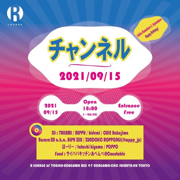 OPEN 18:00 ENTRANCE FREE GENRE : HOUSE / TECHNO DJ : TAKAMI / BEPPU / hidemi / CHiE Nakajima / Basara-ZA a.k.a. ALPH ZEN / ZUNDOKO ROPPONGI / ほーりー / takeshi kiyama / POPPO FOOD : サイババキッチンあべんべ@Cocotable