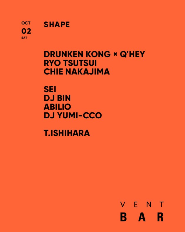 【 東京最長寿テクノパーティー“REBOOT”からQ'HEYを迎え、DRUNKEN KONGが主宰する“SHAPE”が10月2日にVENT BAR で開催! 】