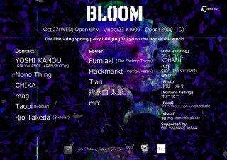 今回、ゲストにはエモーショナルなプログレシッブ・ハウスやダッチ・トランスを得意とするNONO Thingがラインナップ。ageHaやWOMBでのハードテクノやトランスを主としたビッグパーティのサポートを務めてきた。大型会場に機能するそのビッグサウンドはこの日もオーディエンスのダンス欲を解放させる。さらに、ハードテクノからシュランツまでをも用いて高揚の極限を攻めるCHIKAや、ベルリンを中心に世界20カ国30都市以上でのギグをこなしてきた、BLOOMのオーガナイザーであり、世界視野のイベント製作プロダクションGIA VALANCE JAPANのマネージャーYOSHI KANOUによるアップリフティングなイベントデザインで、解放した音楽空間が演出されそうだ。BLOOMを出発点として、都内にブッキング頻度を高める数多くのDJを輩出してきたように、今回も、強いオリジナリティを備えるDJ陣のヴィヴィッドなプレイに期待が高まる。フロアではブラックライトを多用するアベ ユウナやKOHARUのライヴペイントや、ホロスコの占いなど五感を刺激する様々なアトラクションが展開する。