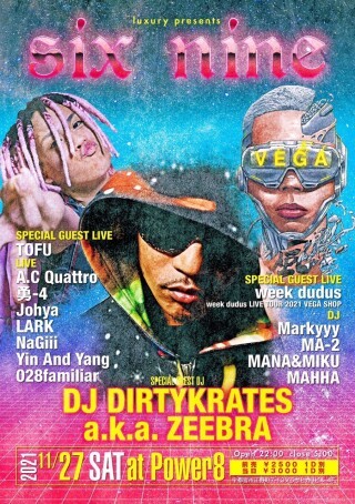 LAXURY presents【six nine 】11/27.sat OPEN 22:00〜 Special Guest DJ / DJ DIRTYKRATES a.k.a. ZEEBRA Special Guest Live / week dudus ・TOFU