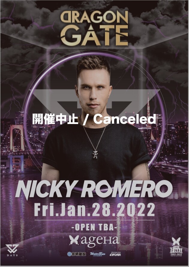 2022年1月28日(土)に予定しておりました『DRAGON GATE SPECIAL』へのNICKY ROMEROのageHaでの来日公演は中止とさせていただきます。