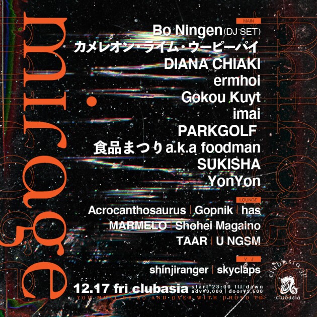 さらに深夜のフロアを彩るのはテクノ・アーティストとして活動の場を広げ、ストイックでミニマルなビートを得意をするDIANA CHIAKI、マルチな活動でシンガーとしてもファンを増やしているYonYonは《mirage》で特別に自身のルーツでもあるアグレッシブなセットを、ロンドンを拠点に活動するBo Nigenは25日に行われる来日リリースパーティーに先駆け、クリエイティヴ・ユースが常に注目する英NTSラジオで披露しているDJ SETを日本初公開する他、ラウンジにも豪華DJ陣を迎える。