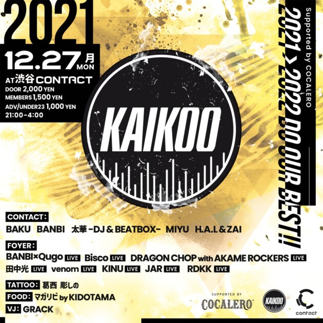 Contactフロアでは、DJ陣が中心。KAIKOOのボスBAKUはもちろんのこと、 KAIKOOレーベルより「BURST」をリリースしたドラムンベースDJのMIYU、「Junglist in Tokyo」をリリースしたDJ H.A.L & ZAI、「2021ep」をリリースしたBANBI、BAKUの盟友ビートボクサーの太華がDJ&ビートボックスでフロアを盛り上げる。