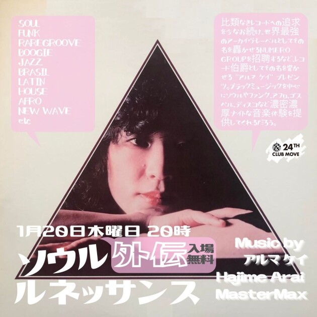 比類なきレコードへの追求を今なお続け、世界最強のアーカイヴ・レーベルとしてその名を轟かせるNUMERO GROUPを招聘するなど、レコード伯爵としてその名を響かせる "アルマ ケイ" プレゼンツ。ブラックミュージックを中心にソウルやファンク、アフロ、ゴスペル、ディスコなど濃密濃厚ナイトな音楽体験を提供してくれるだろう。