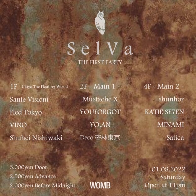 SelVa とはスペイン語で「密林」という意味。本パーティー SelVa は、創造的な実験、自己発見、自己表現のための集まりの場。コンセプトはダンスフロアの中で日頃の疲れを癒すジャングル空間作りをしている。