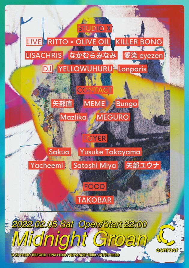 Contact初登場となるRITTO × OLIVE OILのコンビネーション。RITTOのラップにみられる南の風土が培った体を流れるフロウは、共鳴や世界へと引き込む力で他と一線を画している。自身のレーベル〈OILWORKS〉の世界での声望や、驚愕のイマジネーションを携えたOLIVE OILとの邂逅は数あるラッパーとの共演でも群を抜いており奇跡とまで言っていい。この両者と〈BLACK SMOKER RECORDS〉を主謀するKILLER-BONGは、三者相互に音楽感を重ねる関係で、その相乗効果がもたらす非現実空間はリスナーを幽玄の音楽旅行へ連れて行ってくれるはずだ。2019年〈OILWORKS〉からのアルバム「Akasaka」で話題をさらったLISACHRISは、作品中でもみせた繊細さと底なしの深みと特有の歪みを、快楽のビートにのせて鳴らしてくれるに違いない。Diplo主宰〈Mad Decent〉からのリリースや、Four TetやBen UFO、Nina Las Vegasなどのトップクラスから楽曲がサポートされるなど世界的な評価を受けるなかむらみなみや、作品を通じてトリップとラブの探求を表現するラッパー愛染 eyezenなど、声とビートによる愉楽は尽きない。