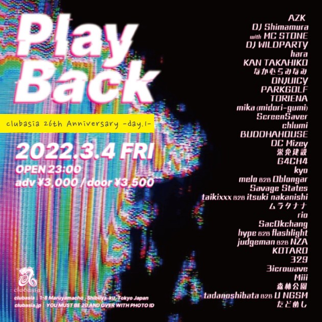 この日よりclubasia26周年月間がスタート!!【Day.1】は由縁あるアーティストを中心に"Rush construction"や"EXODUS"のメンバーも参戦でジャンルレスに楽しめる一夜!!是非にお越しください!