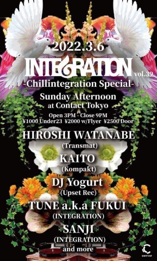 DJ、ライヴ、アートや出店など各種コンテンツの融合をコンセプトに、独自の空間を築き上げるパーティINTEGRATION。2010年秋に代官山Airの平日レギュラーパーティとしてスタートし、2017年からは渋谷Contactのサンデーアフターパーティとして数々の豪華ゲストDJ&ライヴを投入しつつ開催都度に盛り上がりを見せてきた。