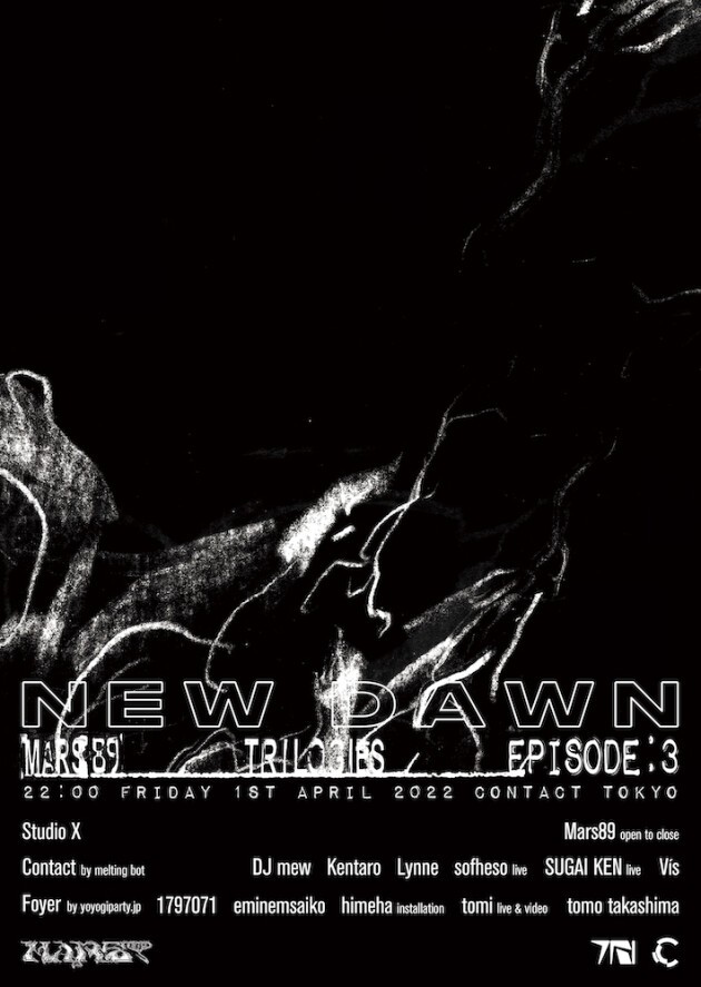 Contact、Foyer両フロアをメイクするmelting botとyoyogiparty. jpは、東京を席巻する現行レイヴシーンが形成される上で、重要な一角を担ってきた。melting botが主催するパーティLocal Worldに象徴される、DIY、クィアネス、ミーム、アートやファッションといったワードを巻き込んだデジタルネイティブによる安息の地は、強烈なエネルギーを伴いながら同心円を大きく広げている。DJ mewやLynneといった、ベースミュージックに素地をもちながらも立体的に広げられる解釈や、SUGAI KEN やsofhesoなどの複層的なエクスペリメンタルなど、ビートやカテゴライズに対して柔軟な発想をもちながらも享楽的なMelting botらしいキュレーションが施された。一方、代々木公園で定期的に開催されてきた、エキシビションとパーティーが融合するyoyogiparty. jpは、かつての代々木公園がそうであったようにエネルギーの発散場や、発想の集積場として機能しており、その強い求心力はクリエイターやアーティストの特殊な才能を引きつけている。Ms.Machineのギタリスト1797071や、eminemsaikoをはじめとする今回のラインナップも、超現場主義ともいえる、イマジネーションの爆発的な膨張を起こしうるワンダーゾーンを描き出す。