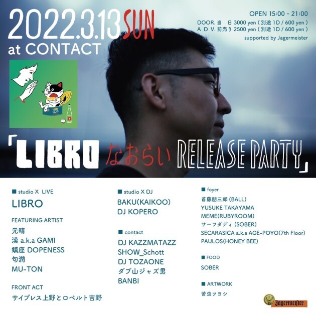 For this party, LIBRO's comrades Cypress Ueno and Roberto Yoshino will be taking the stage as the front act. 元晴 (Motoharu), 鎮座DOPENESS (Chinza Dopeness), 句潤 (COOL), MU-TON, who have all collaborated on this album will perform live, as well as 漢 a.k.a GAMI (Kan a.k.a GAMI), LIBRO's close affiliate, will join LIBRO for his live performance.