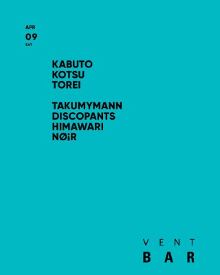 東高円寺Grassrootsにて行われている自身のレギュラーパーティLAIRや、DAZE OF PHAZEの主宰をつとめLowMoneyMusicLoveやToiToi Musikなど海外ポッドキャストへのミックス提供、「Paste of Time」など過去数枚のミックスCDをリリース。そのグルーヴと確かな手腕で独自のテクノ~ハウスのシーンを自ら切り開き広いフィールドで活躍を続け多くのフロアから大きな支持を得る KABUTO が久々にVENT BARへカムバック。共演には、Rainbow Disco Clubへハウス・ミュージック・コレクティブ“CYK”として出演し、一昨年に京都へ拠点を移して以降もより活動範囲を広げダンスミュージック及びクラビングに おけるピュア・エナジーを全国規模で放出し続けているKotsuが登場する。オープニングは東高円寺のGrassrootsでパーティーMegacity主宰し自身のレーベル”Set Fire To Me”やeggae Shop NATのレーベル”Shinjuku Tracksからリリース、NTSやNoodsなどの海外ラジオへのミックス提供を重ね、本年のRDCへの出演も先日アナウンスされたTorei が務める。