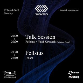 3月7日のWOVEN(GH STREAMING)は、2月にLAのレーベル〈Dome of Doom〉からEP「Mesa」をリリースしたFellsiusが登場!今回もトークセッションとDJセクションの2部構成でお届けする。トークでは、「Mesa」を中心にFellsiusの現在のビジョンに迫り、DJでは自身の楽曲だけで構成されたセットを披露。今日の日本のクラブシーンにおけるブライテストホープの”今”に、ぜひ注目してほしい。