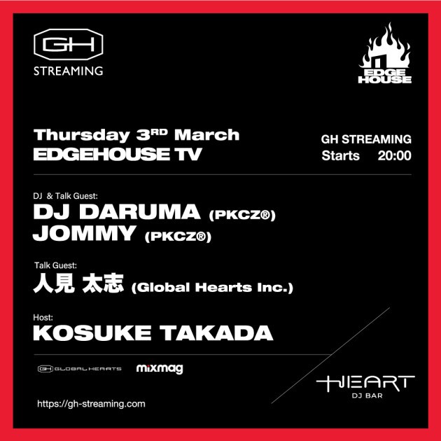オーガナイザーKosuke Takadaが番組ホストを務め、EDGE HOUSEにゆかりのあるDJやアーティストたちから最新情報や制作秘話、さらにはプライベートまで掘り下げる。前半はトーク、後半はDJ MIXと、見応えのある内容です。3月3日(木)のEDGE HOUSE TVにDJ DARUMAとJOMMYが登場。エジハの中心人物である2人を迎え近況を探ります。