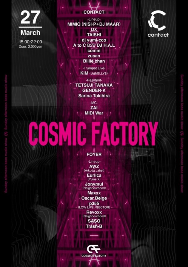 東京-沖縄を繋ぐ数々のビックパーティをプロデュースしてきたTETSUJI TANAKAとGENDER-Kの"COSMIC FACTORY"が新たに仕掛けるコンセプチュアル・パーティをContactで開催!ドラムンベース × ベースミュージックのクオリティーな側面をフォーカスした贅沢な空間を演出する。ヘッドライナーにベースミュージック日本代表としてクロアチアOUTLOOK FESTIVALに9年連続出演するなど国内外で活躍を続けるPART2STYLEのNISI-Pと元DEX PISTOLSで最新ソロアルバム「Disco Phychedelica」を発表したクラブシーンのカリスマDJ MAARの最注目ユニットMIMIQが登場!