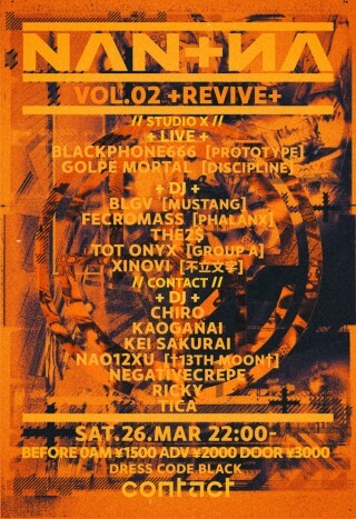 Once again, a lineup where the modern and old-school intersect is a must see for fans. Tot Onyx, the solo alias of Berlin-based Tommi Tokyo from group A who's currently in Japan, creates a multi-layered collage of emotional stop motion animation-like feel within the sounds of electronica and experimental. His cult-like soundscapes that stimulate our nostalgic sensibilities have become a big topic of this event. BLACKPHONE666 released「PTN.YLW / HARM TAPE」last year. Compiled of distinct inspirations, harsh noise, driving gabba kicks, it is a true work of art that only comes from experience performing live and studio work. HIs live performances, one of the best in the noise/avant-garde scene of Japan by dominating the audience's mind and body, are radical yet delicate and instantaneous yet structured. The contemporary machine live set by Golpe Mortal, a prominent figure in the industrial/wave music scene who has performed as the supporting act of international artists the likes of Phase Fatale and Verset Zero, DJ sets by nAo12xu, expert in post-punk/goth/minimal wave, and a rare set by Kaoganai sparks an undying interest. In addition、BLGV, FECROMASS, the2$, XINOVI, and elites of hard techno/industrial that links to the German scene will guide you further into a dark frenzy.