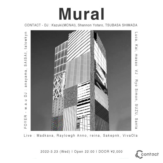 昨年、第1回目のオーガナイズパーティの開催、そしてTatsuoki氏主催のパーティであるBroadにて、フロアーオーガナイズを経験したMuralクルーが、第2回目となるオーガナイズパーティを開催する。今回のパーティでは、未だ終息の目処が立たないコロナ禍でも、耐えず勢力的に活動を続けてきたインディレーベルのw.a.uと共創し、一夜を彩る。Contactではアンビエント、ミニマル、インダストリアルテクノ、ジャングルに加え、昨年末のMutek出演でも記憶に新しいVJ陣の参加により、ジャンルレスな音と視覚表現によるアプローチで新進気鋭なシーンに一体感をもたらす。Foyerはw.a.uが放つ煌びやかな生音のセッションによって、生み出される強烈な音楽体験が必見。