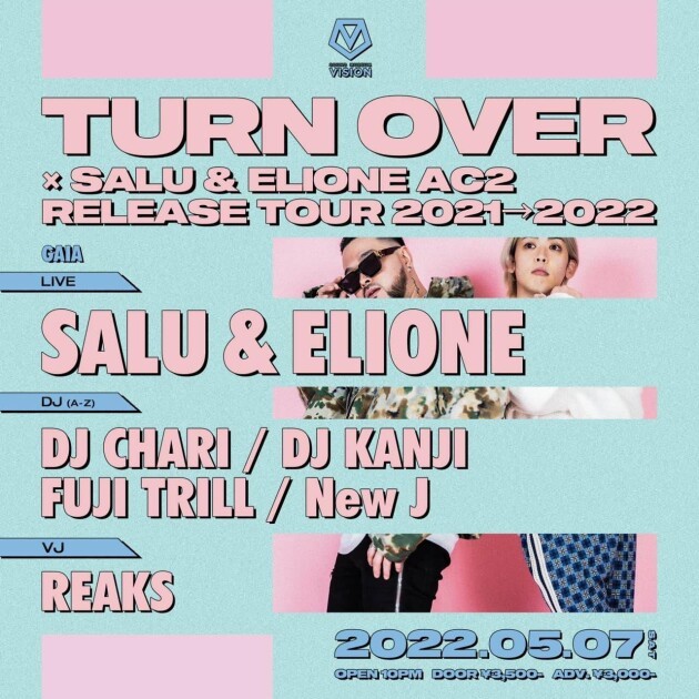 昨年10月に、ユニットとしては初となるEP『AC2』をリリースし、EPのアートワークにも登場する、猿とライオンが登場する全編アニメーションPVが話題となっている彼らが “TURN OVER × SALU & ELIONE AC2 RELEASE TOUR 2021→2022”としてVISIONに初登場!!!