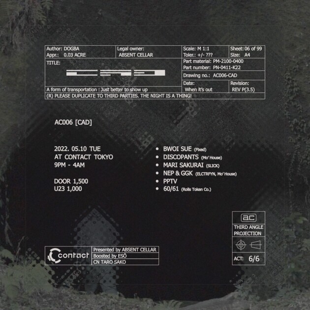 ABSENT CELLARは音楽を物理的にフォーカスするマルチコレクティヴ。2020年に行われたイベントAC005 [DID]を経た約2年越しとなるフィジカルパーティAC006 [CAD]が開催される。
