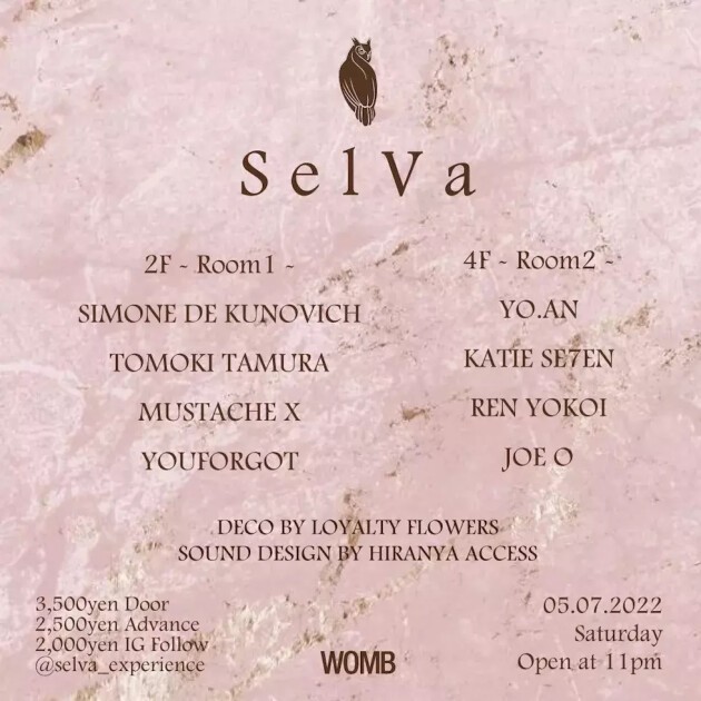 SelVa とはスペイン語で「密林」という意味。本パーティー SelVa は、創造的な実験、自己発見、自己表現のための集まりの場。コンセプトはダンスフロアの中で日頃の疲れを癒すジャングル空間作りをしている。