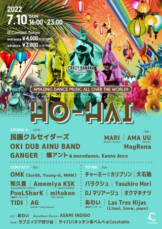 ワールドミュージックで陶酔する多幸的夜祭HO-HAI。Contactでは最後となる今回、民謡クルセイダーズやOKI DUB AINU BANDなど豪華ゲスト招いてあげる大花火。日本の伝統と世界各地の音楽の魅力を、アヴァンギャルドかつディープにお送りしてきたCRAZY BANANAクルーの、総決算とも言える大祭が幕を開ける。